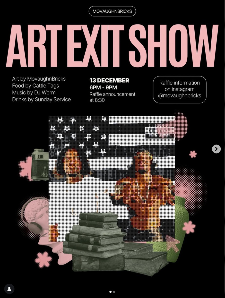Join us Saturday December 13th at 6pm for our Featured artist's show case close out. He will be auctioning off a full sized lego Art piece. Message @movaughnbricks on instagram to buy raffles tickets at $1 a piece.