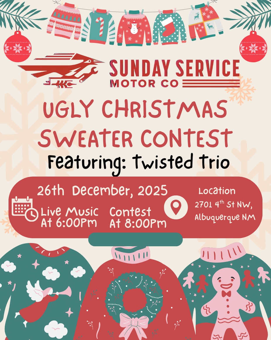 Ugly Christmas Sweater Contest + Live Music Keep the holiday spirit rolling! Join us Friday, Dec 26th at 7PM at Sunday Service Motor Co. for a festive night featuring live music by Twisted Trio.